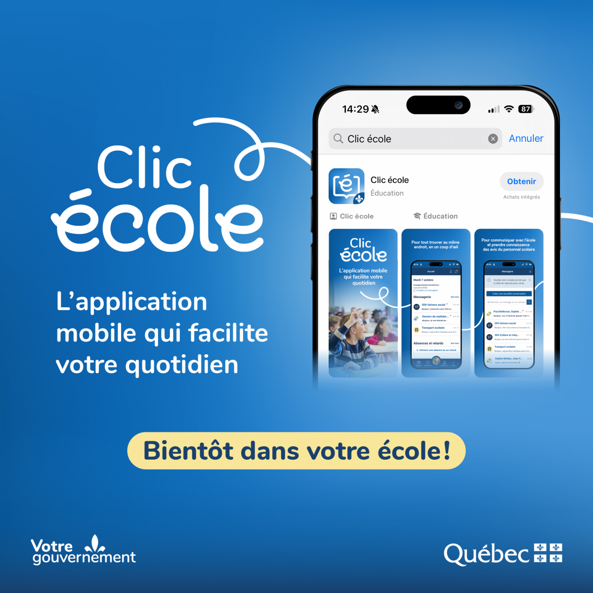 Simple, sécuritaire et pratique, Clic école vous permettra de suivre la scolarité de votre enfant directement à partir de votre appareil mobile, en complément de l’accès en ligne. Cette application remplacera l’application mobile actuelle MParent, que certaines familles utilisent déjà.