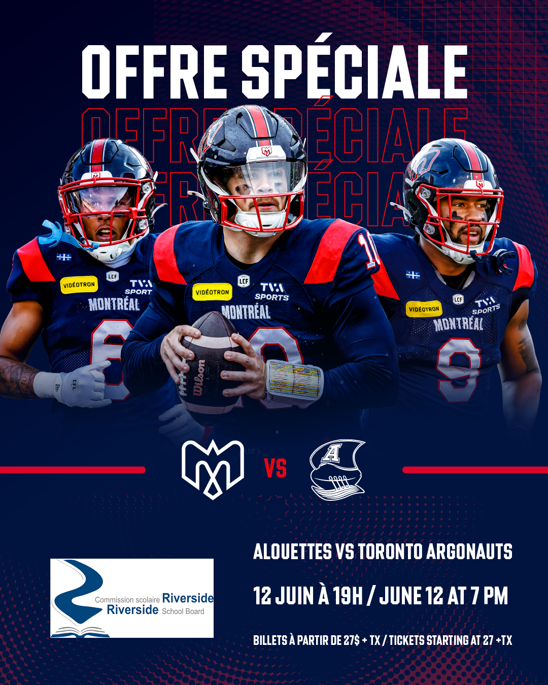 The Montreal Alouettes and Riverside School Board have paired up to offer our community the opportunity to attend a football game at Percival Molson Stadium in Montreal on June 12 at 7:00 p.m.